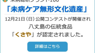 未病ブランド100 12/21(日)「未病ケア無形文化遺産」緊急チャリティー公開コンテストが 開催され、八丈島の伝統食品「くさや」が認定されました。 10月上旬に記録的な大型台風22号・23号の襲来で、八丈島は大きな被害を受けました。 八丈島の伝統的食品「くさや」も断水、停電で工場が破損を受け、「くさや菌」の保存状態にも危険が迫ってきています。 この八丈島の伝統的食品「く... 未病ブランド100
